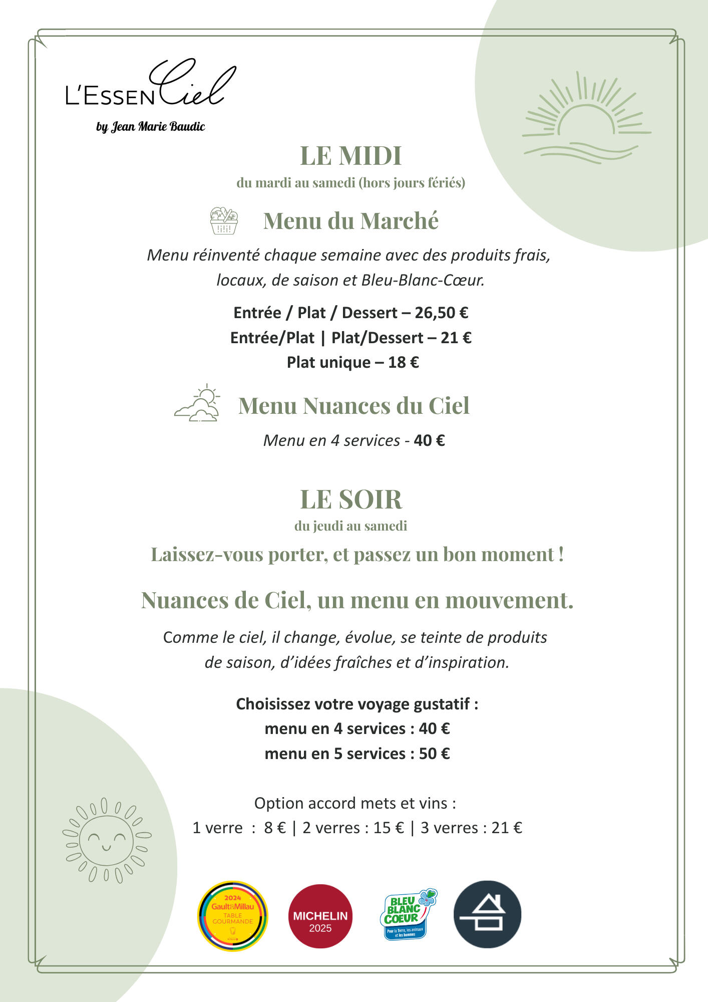 4 ou 5 plats, selon vos envies, pour une découverte gustative unique, au rythme des saisons, des inspirations du chef… et du ciel.🍷 Envie d’un bel accord mets & vins ? C’est aussi possible !