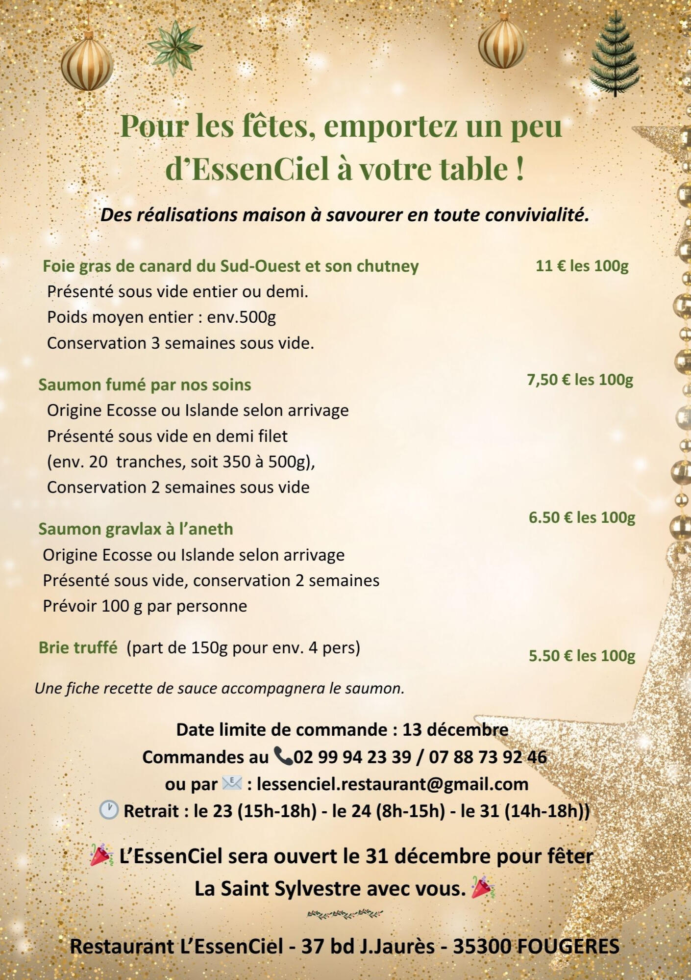 🎄 Préparez vos fêtes avec L’EssenCiel 🎄Cette année, pour les réveillons de fin d’année, laissez-vous porter… :- Menu festif à emporter,